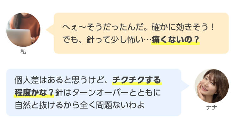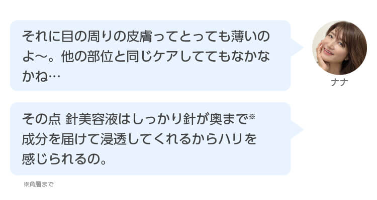 初めてニードル美容液を使った時はチクチクして、大丈夫かなと心配でしたが、3日後位からはチクチクも なくなり、悩みが気にならなくなりました。先日、久しぶりに会った友人から顔にハリがあって艶々してるね!と言われました。続けて1週間、肌のコンディションが良い気がして満足です。