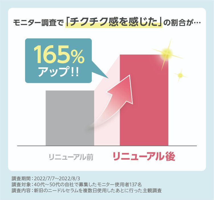 ※調査期間:2022/7/7~2022/8/3、調査対象:40代~50代の自社で募集したモニター使用者137名、調査内容:新旧のニードルセラムを複数日使用したあとに行った主観調査